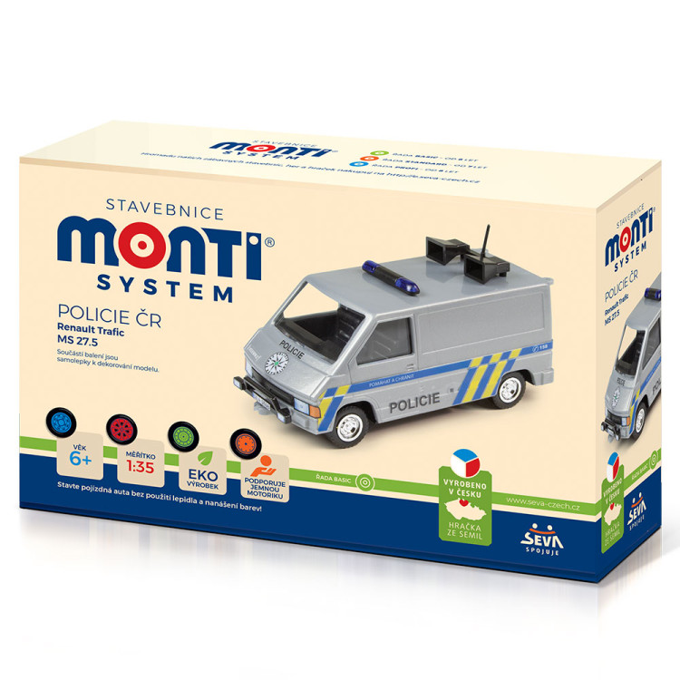 SEVA Monti System MS27.5 - Policejní auto dodávka Renault Trafic, český design Policie ČR. Dětská plastová stavebnice. Sestavení modelu zacvakáváním do sebe (bez použití lepidla a barev).
