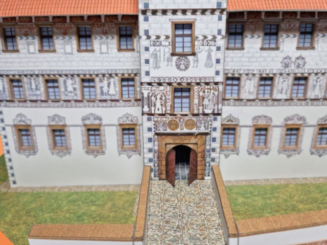 Zámek byl vystavěn v renesančním stylu, je dvoupatrový, s dominantní věží, má čtvercový půdorys a čtvercové vnitřní nádvoří. Návštěvníka na první pohled ohromí bohatá sgrafitová výzdoba, zejména její figurální část, znázorňující jak biblické motivy, tak výjevy z období tureckých válek a antické motivy. Jsou zde však i pruhy a zdobení kolem oken s květinovými motivy a plošné a nárožní kvádrování. Další dominantou je průchozí zámecká věž, vysoká 36 metrů. Její vršek byl v roce 1945 rozstřílen během osvobozování, poté zde byla mnoho let provizorní střecha. V roce 2019 zde však byla osazena replika původní báně, která je 14 metrů vysoká, váží 20 tun a na její výrobu byly použity dvě tuny mědi. Za zmínku stojí i vnitřní nádvoří, obklopené arkádami ze všech čtyř stran (což je v českých zemích u renesančních zámků unikátní). Renesanční arkády jsou vystavěny ve všech třech podlažích. V přízemí jsou sloupy osmiboké, v obou patrech válcové. Na ochozech jsou zbytky sgrafit naznačující, že zámek byl v minulosti bohatě zdoben nejen zvenčí, ale i na nádvoří zámku. Bývalý vodní příkop je překlenut kamenným mostem s jedním obloukem – v minulosti zde však stával dřevěný padací most. V kamenné zdi může pozorný návštěvník vidět malá vrátka – kdysi zde byla chodba patrně vedoucí do kočárovny, dnes je však již zasypaná a vzhledem k častým stavebním úpravám v okolí již asi nikdy nebudeme vědět, jaký byl její pravý účel.